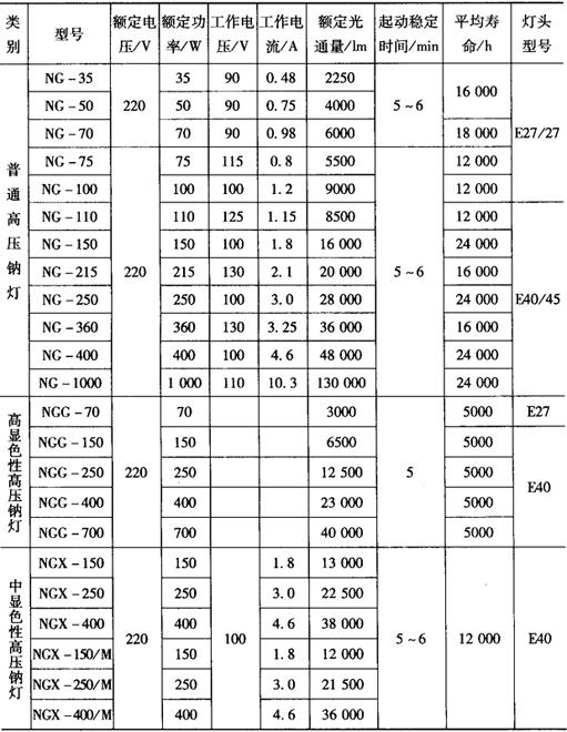 2.高强度气体放电灯的主要技术数据 高强度气体放电灯的主要技术数据见表9-22~表9-32。 表9-22 NG和NGG型高压钠灯的主要技术数据