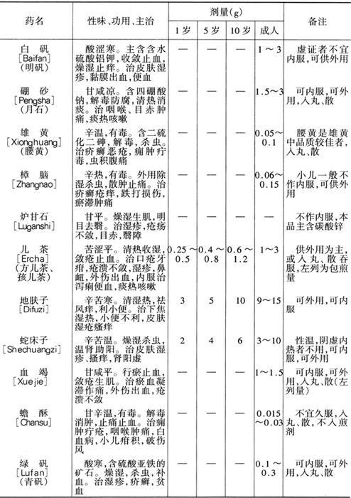 以下所述大多为外用药,具有消肿解毒、收敛止血、化腐生肌、排脓止痛等作用。其中有些药也可供内服,但应注意严格控制剂量,以免中毒。
