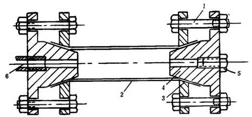 图10-3-14 液压试验装置 1-紧固螺栓 2-试样 3-法兰 4-密封塞头 5-排气孔 6-接压力机头 液压机注满一定温度的油,放置一段时间后,逐渐升压直至试样出现破裂或渗漏现象时为止,记录此时的液体压力作为试样破裂内压力(kgf/cm2)。 在生产中作为质量控制的检验,是在规定的温度、液压下保持1h。以是否出现破裂渗漏现象来评定产品,不出现破裂渗漏者为合格,液压由下式计算。