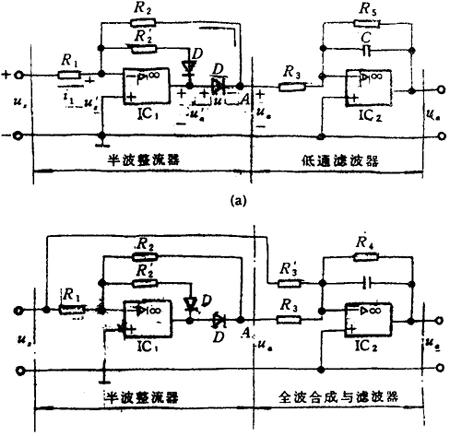 a)半波整流器 b)全波整流器 图3.4-19 线性整流器 图3.4-20b)为全波整流器。充分利用了输入信号的正、负半周信号,如不考虑低通滤波影响,则: