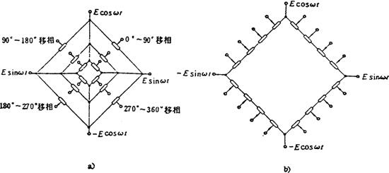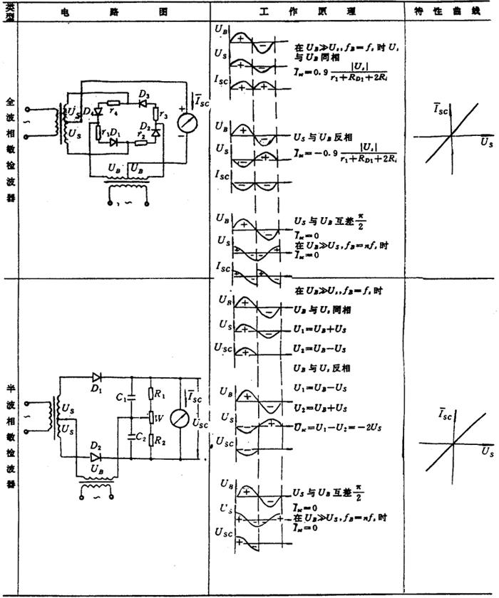a)串联桥 b)并联桥 图3.4-20 电阻链分相细分 (2) 相敏检波器 相敏检波器用来对调幅或调相信号进行解调,在电子细分等测量中常常使用,基础电子线路原理图见表3.4-3。 表3.4-3 相敏检波种类