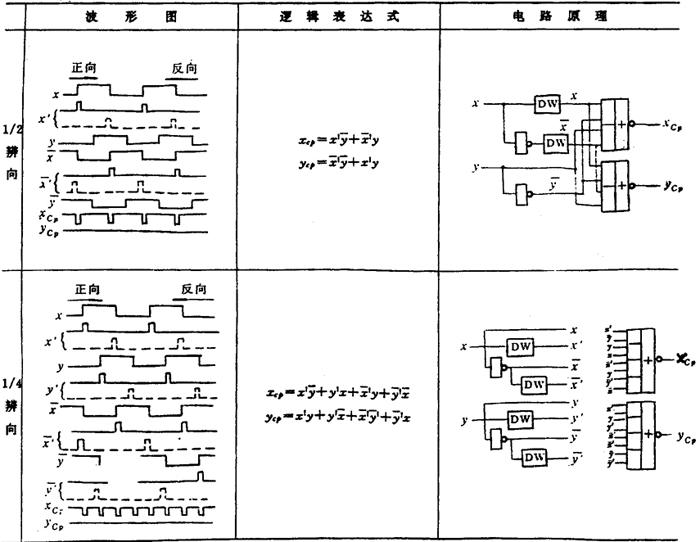 Us:信号电压 CB:参考电压 r1~4:桥路平衡电阻 D1~4:检波二极管 R1~2:负载电阻 C1~2:滤波电容 W:平衡电位器 Isc:流过表头平均电流 Usc:输出电压 RD1:检波二极管内阻 R1:表头内阻 (3) 辨向电路 辨向电路的作用是识别测量运动方向并发出方向信号,以控制计数器计数或平衡方向以及显示符号的正负。广泛应用于磁栅,感应同步器,光栅信号等的处理中。 辨向电路输入信号是经整形后的一组周期性正交方波信号: x=Sign(sin nx); y=Sign(cos nx)。 由x、y的符号,及其正、负沿脉冲信号形成方向信号,并产生正负方向的计数脉冲。表3.4-4为两种典型的组合逻辑式辨向电路。 表3.4-4 组合逻辑式辨向电路