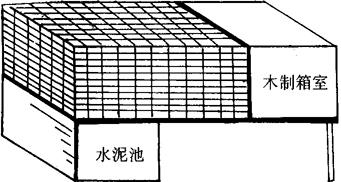 图7-2 双列式棚舍 3.海狸鼠的圈舍 海狸鼠的圈舍构造与养殖地区的终年气温有关,常年气温在0℃以上或低于0℃时间持续较短的地区,圈舍可建在室外,露天饲养;冬季天气寒冷的地区,要把圈舍或笼舍建在室内,在气温不低于0℃环境下饲养。圈舍分围墙式和笼式两种。围墙式(图7-3)一般采用砖、石、水泥等建筑材料建成,分窝室、水池和运动场三部分。窝室一般长80~100厘米、宽80~140厘米,前墙高80~90厘米、后墙高60~70厘米。运动场长180~220厘米、宽80~140厘米,墙高80厘米。水池长50~60厘米、宽80~140厘米,墙高70~80厘米。笼式圈舍一般建在室内,由笼、箱室和水泥池组成(图7-4)。笼是铁丝网结构,长130~140厘米、宽60~80厘米、高50厘米;箱室为木制,长80厘米、宽60~80厘米、高50厘米;水泥池长50厘米、宽60~80厘米、深30~40厘米。