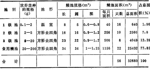 此外,电源充足,交通方便,地形整齐,地势平坦,土质良好等条件也很重要。 2。鳗场设计 目前我国养鳗场的类型有四种:类似普通养鱼池塘的静水式露天池;利用工厂余热水或地热水建成的半温流水式和全温流水式;利用锅炉加温的工厂化循环过滤式。静水式露天池一般每天换水量仅占池塘水体的10—15%,主要依靠水中浮游蓝藻进行光合作用,得以增加溶氧,净化水质。其优点是造价低、节水、节能,但亩产仅1—1.5t。因此单独建造这种鳗场,生产效率不高。生产部门最常用的是采取温流水和露天池配套的养殖方式,其设计要点如下: (1)露天池的设计:依不同阶段的生产特点,鳗池分为一级池、二级池、三级池和食用鳗池四种。各种鳗池的面积比例为2∶8∶15∶75。例如建一个50亩水面,亩产1.5t,总产75t的养鳗场,需建一级池(或温室)1亩,二级池4亩,三级池7.5亩,食用鳗池37.5亩。各类池的规格和用途见表33—3。 表33—3 露天池温室配套鳗场的鳗池类别