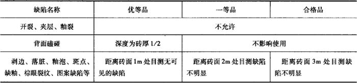 根据外观质量釉面砖可分为优等品、一等品和合格品三个等级。其表面缺陷允许范围应符合表16-7中的规定。