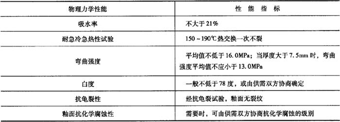釉面砖的物理力学性能主要包括吸水率、耐急冷急热性、弯曲强度、白度、抗龟裂性和釉面抗化学腐蚀性等。其物理力学性能应符合表16-10中的规定。