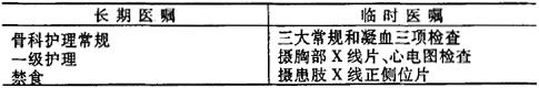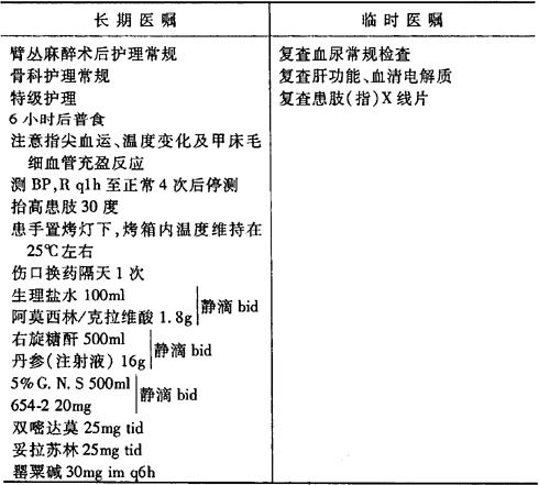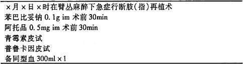 说明:断肢(指)再植术为急症,需常规备血300~600ml,必要时备血1000ml以上。 手术医嘱