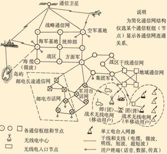| 释义 | 军事通信网 由军用通信线路连接若干通信台站、通信枢纽而构成的通信网络体系。 按通信保障的任务和范围,分为战略、战役、战术通信网;按通信业务,分为电话、电报、数据、图像和综合业务数字网。通常有按指挥系统组网和按地域组网两种形式。 对其基本要求是:能覆盖整个作战地域,便于高速机动部队的通信联络,具有抗毁性、安全性、可靠性、机动性及各种网络之间的互通性。