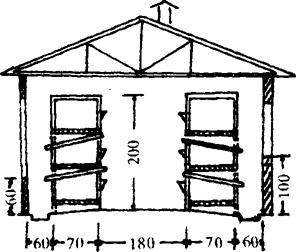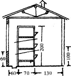1.室内单列式兔舍 这种兔舍四周有墙及门窗,房顶呈双坡式或单坡式,双坡式呈“人”字顶,单坡式呈“ヘ”字形,即群众常说的“道士帽”式。三层兔笼建在离后墙60厘米的地方(离后墙距离视房深浅而定),笼后为排尿沟及清粪道,笼前为人行道,便于饲养员操作管理(图12)。