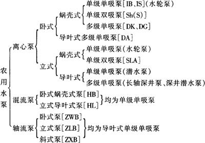 | 释义 | 农用水泵及其类型 (一)农用水泵的含义 主要用于农业生产、农田排灌和农民生活的水泵称为农用水泵。 不同的水泵,压水原理是不同的,常用农用水泵的压水原理可分为离心式压水、轴流式压水和混流式压水3种。 (二)农用水泵的分类 由于用途不同,要求各异,农用水泵有多种多样的形式,可按照不同的分类标准进行分类。 1.按工作原理不同分类 农用水泵按工作原理可分为叶片泵,如离心泵、轴流泵、混流泵等;容积泵,如柱塞泵、隔膜泵、齿轮泵等;其他类型的泵,如射流泵、水锤泵等。 常见的农用水泵主要是叶片泵,可概括为离心泵、轴流泵和混流泵三大类。叶片泵的共同特点是都有一个或数个叶轮,叶轮上装有数量不等的叶片。 2.按构造及使用要求分类 离心泵、轴流泵和混流泵,实际上是根据液体从叶轮流出的方向进行分类的。离心泵是液体受离心力的作用,沿径向流出叶轮的一种叶片泵,所以又叫径流泵;轴流泵是液体在推力的作用下,沿轴向流出叶轮的叶片泵,故又名旋浆泵;混流泵则是在离心力和推力的双重作用下,液体沿斜向流出叶轮的一种叶片泵,因此也称为对角线式泵或斜流泵。 离心泵按其叶轮进水方式,可分为单吸泵(叶轮单侧进水)和双吸泵(叶轮双侧进水);按叶轮的数目又可分为单级泵(一台泵上只有一个叶轮)和多级泵(将两个或两个以上的叶轮装在同一根轴上串连工作,装几个叶轮就叫几级泵);按泵轴的方向不同可分为立式和卧式。轴流泵按其泵轴的方向可分为立式、卧式和斜式;按叶片安装角是否可调,分为固定叶片式、半调节式和全调节式。混流泵按泵轴的方向也可分为立式和卧式,按泵体的结构可分为蜗壳式和导叶式。 根据构造和使用的要求,叶片泵中还有自吸泵、长轴井泵、潜水电泵、水轮泵等。长轴井泵有一个长的传动轴,根据井的结构和扬程的高低,又可分为浅井泵和深井泵。潜水电泵是与电动机联成一体,潜入水中抽水的泵;用来从深井中抽水的潜水电泵叫深井潜水电泵。自吸泵是在泵体内储有部分水体,能自行排气充水的离心泵。水轮泵是利用水流驱动水轮机带动同轴的水泵抽水的一种叶片泵。 常用农用水泵的分类综述如下: