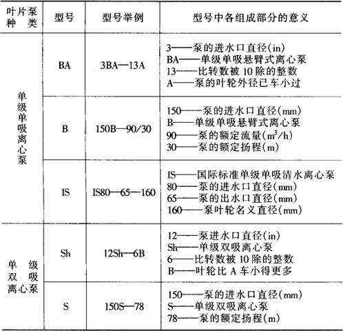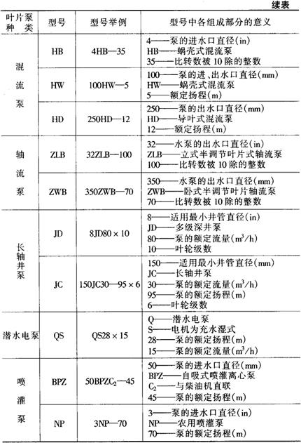 (三)农用水泵型号的识别 农用水泵的种类很多,规格各异,不同类型的水泵,按其口径、结构形式和有代表性的性能参数,分别编制成不同的型号,以便于选用或订购。 我国农用水泵型号一般用汉语拼音字母和阿拉伯数字组成,组合形式一般为:阿拉伯数字-汉语拼音字母-阿拉伯数字。通常前面的阿拉伯数字表示泵口径,单位为in,中间的汉语拼音字母表示泵型及结构,后面的阿拉伯数字表示比转数被10除后的整数。20世纪80年代改型后,前面的数字多为以mm为单位表示的口径,后面的数字,除轴流泵外,多改为水泵的扬程(m)。 常用叶片泵型号的识别及意义可见表8-1。 表8-1 常用叶片泵型号的识别及意义