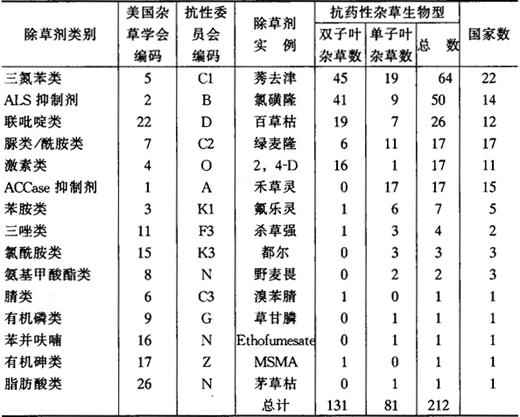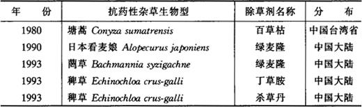 当人们正欲接受抗草甘膦转基因作物时,在澳大利亚出现了抗草甘膦的瑞士黑麦草。我国也报道了塘蒿、菵草、稗草、看麦娘等5种杂草生物型对百草枯、丁草胺、杀草丹、绿麦隆等除草剂产生了抗药性(表1-3)。 表1-3 已报道的我国抗药性杂草生物型