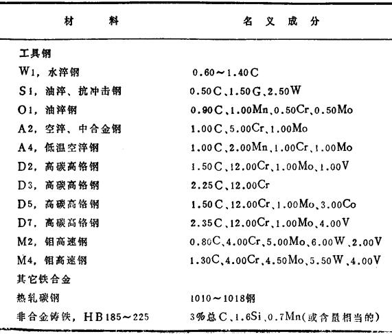 | 释义 | 冲压成形模材料的选择 冲压成形是通过弯曲或适度的延伸,或两者兼有之使薄板金属制成与凹模和凸模的轮廓一致的工艺。合适的冲压成形模材料,要根据那种模具所能生产的零件的数量来决定。影响模具使用寿命的有零件的形状和尺寸、被成形的材料种类和厚度、润滑和允许的尺寸变化的程度。 表41为常用的冲压成形模材料的名义成分。模具材料通常是以尽可能低的成本,而又能达到一定的使用寿命作为选择依据的。但是,最终的选择,往往更注重于使用性能,而把模具寿命和成本上的微小差异放在次要的位置。 表41 常用于成形模的工具材料