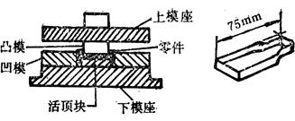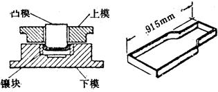 图36 用于中等复杂程度大零件的模具横剖面 (典型的零件材料见表43) 表43 用1.3mm薄板成形中等复杂程度大零件用的典型的下模材料 (模具剖视图和零件形状见图36)