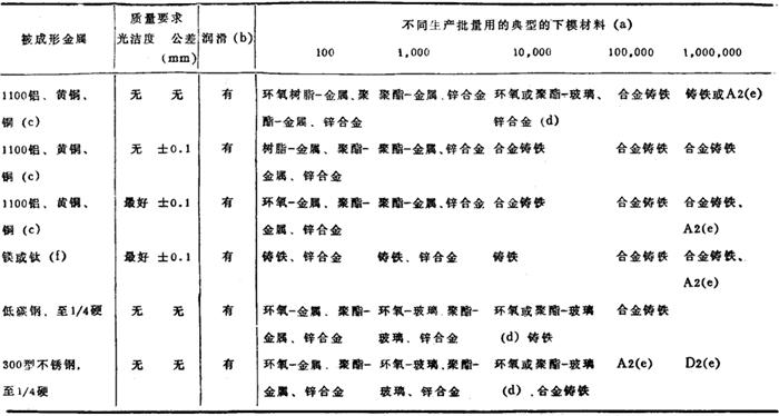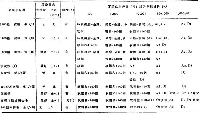 图35 用于中等复杂程度的小零件的模具横剖面、典型的模具材料见表42 表42 用1.3mm薄板成形中等复杂程度小零件用的典型的下模材料 (模具横剖面图和零件形状见图35)