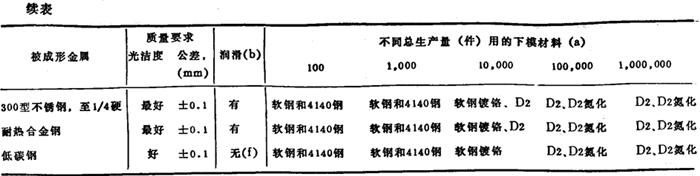 注:(a)模具材料种类见表41。当在同样的条件下给出几种可供选用的材料时,按成本的增加顺序排列,但材料的最终选择常常取决于使用效果,宁可在成本或性 能上有微小差异。成形批量小于10,000件时,推荐可用软钢,而且不经热处理:成形批量≥10,000件时,模具应渗碳淬火。表中4140钢在用于批量小于10, 000件的生产时,应预处理到HRC28~32;在批量大于10,000件时,高磨损区采用火焰淬火, (b)特殊润滑, (c)软的。 (d)带镶块。 (e)在铸铁模座中用作镶块, (f)经加热的薄板。 (g)应用润滑制造1~100件。 在冲压成形类似图36所示的大零件时,典型的下模材料如表43所示。在生产数量小于100,000件时,采用表中材料制成的整体模,而不用镶块模。凸模用较低的抗磨损材料制成,即和所需生产数量靠左第一行的下模材料相同。 供制造厚于或薄于例子中1.3mm的薄板零件,或制造复杂程度比图35和图36所示的零件稍难或稍易的零件的下模材料可由表42和表43选择。对于更复杂或更厚的薄板零件,推荐用比实际生产批量更大的下一档生产批量的下模材料(即表中实际生产批量的右栏)。对不太复杂或较薄的薄板零件,推荐用较低生产批量的下模材料(即表中实际生产批量的左栏)。 抗擦伤材料的选择 擦伤是成形金属对模具产生的冷焊,它极大地影响模具所能生产零件的数量。擦伤是由于金属薄板延伸超过规定极限、润滑不足、模具装配不良、光洁度粗糙等原因造成的。因此,一旦发生擦伤时,要首先检查模具配合及成形金属的厚度,确定间隙是否符合要求。如果间隙足够,在更改模具材料前,应首先检验润滑情况。如果模具材料及成形金属在硬度、化学成分和表面特性不类似时,那么,擦伤也不相同。因此,可作如下有效的合并:①成形碳钢及不锈钢可用铝青铜模具:②成形铝及铜合金可用工具钢模具;③成形碳钢、不锈钢和铝可用硬质合金模具。 铝青铜具有很好的抗擦伤能力,因此,用它来制造要求很高光洁度的碳钢或不锈钢零件的模具是称心合意的。然而,在中高批量生产时(10,000~100,000件)应该用镶块,以便于磨损模具的修复。 氮化可减少或防止合金钢或含铬和钼合金工具钢(例如A2或D2)模具的擦伤。但氮化表面,在圆弧半径小于3mm,特别是模具的型腔复杂时,易引起剥落。 硬的镀铬能够克服软钢、合金钢和工具钢模具的擦伤,它常在重载荷下应用。在带有大的局部应力工序时,淬硬的合金钢或工具钢不容易产生塑性屈服和引起镀硬铬层的裂纹。对复杂零件的模具,在圆弧半径小于6mm时,硬铬镀层易于剥落。 对于某些冲压成形工序的模具,选用其它工具钢比选用上述所讨论过材料可能更适合些,例如S1~S5和S7可用作经受冲击的模具的零件;H11和H13可以氮化,用作大的抗磨损的模具及其零件。在冲压成形工序中,比D2和氮化D2有更高的磨损寿命要求时,有必要选用更抗磨的A7、D3、D4或D7钢,或M2、M4、M5等高速钢。如在图317-7PH不锈钢的法兰的例子中,阐述了通过把D2改为更高合金含量的D7和M4钢,可以期望改进模具寿命。虽然韧性也是一个决定的因素,但成本决定了选用的材料是否合适。总成本中包括模具的材料成本、制造成本和中间修理的成本。