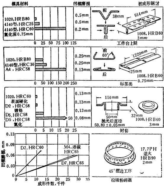 模具寿命 磨损决定冲压成形模的使用性能。而由摩擦磨损或粘焊磨损或二者均有而产生的总磨损,则主要受生产批量和成形工序复杂程度的影响。 在成形过程中,模具的磨损量是和薄板金属在模具接触表面间滑过的累积的总距离成正比的。薄的、软的或低强度的薄板金属,成形时压力最低,因此,模具磨损也最少;厚的或中等强度的金属,模具的磨损就较快。模具与工作金属的磨损速率是可以变的,它取决于表面特性,成形速度和所采用的润滑剂。由于局部区域产生变薄,在零件上会形成皱纹,因而在模具上会发生高的局部集中压力,并通常遇到不允许的高的磨损速率和擦伤。 典型的模具材料 成形图35所示零件的模具由凸模和凹模组成。在工序中,凸模把坯料推入凹模,并引起凹模的磨损。由于金属紧紧的贴于凸模上,只有小的滑动,因此,凸模使用寿命可比同样材料的凹模高10倍。但是,在零件的收缩区,凸模的表面会发生一定的磨损,特别是当成形是在单动模里完成时,更是如此。对小的凹模和凸模,因为工具钢的成本是微不足道的,因此,在批量小于10,000时,也可使用D2型工具钢。对易发生擦伤的模具,可进行氮化。图35所示小零件冲压成形用下模的材料如表42所列。