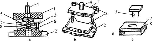 图8-57 简单冲孔模 a.冲孔模 b.模架 c.工作部分 1.上模座 2.下模座 3.导向装置 4.模柄 5.凸模 6.凹模 7.卸料板 8.导料尺 1.落料模 图8-58为导板式简单落料模,上模由模柄、上模座、垫板、凸模固定板和凸模组成。下模由下模座、凹模、导料板、挡料销和起导向作用的导向卸料板组成。