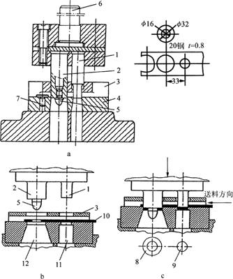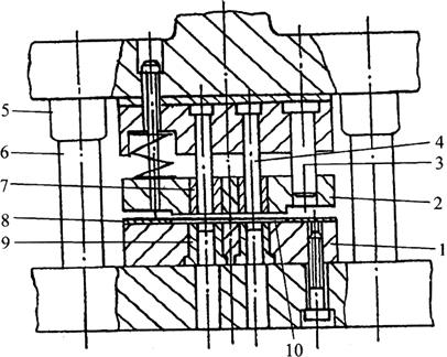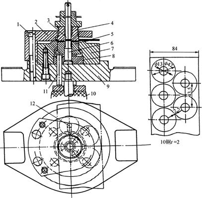 图8-59 带小导柱和弹性卸料板冲孔模 1.凹模固定板 2.弹性卸料板 3.小导柱 4.凸模 5.导套 6.导柱 7.淬火套 8.导尺 9.凹模 10.挡料板 该模具的工作部分为凸模、凹模固定板,定位及挡料部分为导尺、挡料板,卸料装置为弹性卸料板,导向装置为导套、导柱、小导柱,弹性卸料板也兼起凸模导向作用。 矩形毛料由前向后送进时,左右靠导尺导向,后面有挡料板定位。冲孔后凸模将废料由凹模孔推下,弹性卸料板将箍在凸模上的零件卸下。 (二)连续冲裁模 连续冲模又称级进模或跳步模,是在压力机一次行程中依一定顺序,在同一模具的不同工位上完成冲孔和冲外廓两道以上工序,冲外廓时即以中间冲出的孔定位毛料,这样冲床每一冲程即可获得一个完整的零件。所以,连续模为多工序模,多用于生产批量大、精度要求不高、需要多工序冲裁加工的小零件。 1.销孔定位连续模 图8-60为带导正销的冲制垫圈的连续模,工作时先用始冲挡料销初步定位,待落料凸模下行时,再由装于其上的导正定位销插入预先冲出的定位孔内,上模向下运动,凸模完成冲孔,并将冲孔废料从凹模孔中推下。