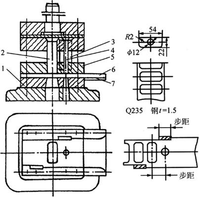 图8-61 侧刃定位连续冲裁模(单位:mm) 1.凹模 2.落料凸模 3.侧刃 4.冲孔凸模 5.导板 6.导尺 7.托板 该模具装有左右两侧刃,右边的侧刃代替了始冲挡料销。侧刃在压力机的每次行程中,沿条料边缘裁下长度等于步距的料边,使剩余条料上左右侧刃导尺间成左窄右宽的凸肩状,且只有侧刃切去料边后条料才能向前送进一个步距。 冲裁工作时,条料自右向左沿导尺送进,至右面侧刃孔被挡停留,上模下行完成冲孔及侧刃切边,条料成凸肩状后可向前送进一个步距,冲得孔后的凸肩状条料便移至落料凸模的下方,上模第二次下行,冲得矩形零件并从凹模孔中推下;同时,冲孔工步又冲得一孔,侧刃又切去一料边,条料继续送进下一工步。从这时起,左侧刃才开始定位,凸模向上回行,箍在凸模上的条料被导板卸下。 (三)复合冲压模 复合模是指压力机一次行程中,在模具的一个工位上同时完成几道不同工序的模具,既可有冲裁也可有弯曲成型,属于多工序模。 例如用复合模冲制垫圈,是将冲孔与冲外廓两个工序复合在一起,下模既是冲孔的凹模,又是冲裁外廓的凸模,称为凸凹模,且凸凹模装在下模上称为倒装复合模,冲孔废料有凸凹模孔向下排出,反之则为正装复合模,向上出件。 采用复合冲压模冲制时,冲床每一行程可冲出一个零件,冲出的零件内孔与外廓的相对位置精度高,零件更平整。因此,复合模适用于产量大、内外形同心度及尺寸精度都较高的冲压件。 1.冲孔落料复合模 图8-62为垫圈冲孔落料正装复合模,工作部分为凸模、凹模、凸凹模,定位及挡料部分为钩形挡料销、卸料板的下部左侧台阶面,卸料及推件装置为卸料板、打杆、顶件器。该模具凹模在下,凸凹模在上,固定卸料板兼起导板作用,冲裁中凸凹模始终不脱离卸料板孔。
