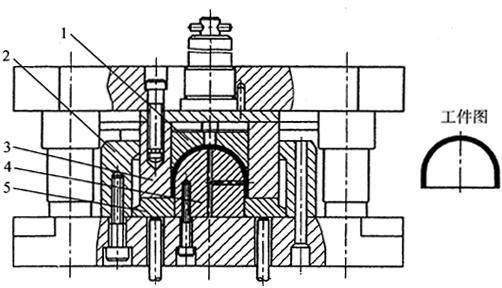 图8-63 杯形件落料拉深复合模 1.推件兼整形板 2.落料凹模 3.凸凹模(落料凸模兼拉深凹模) 4.拉深凸模 5.压料圈兼顶板 3.落料冲孔翻边复合模 图8-64为继电器外壳底板落料冲孔翻边复合模,其在一次冲程中可以同时完成落料、冲孔和翻边三道工序。其中,凸凹模和固定板上的凹模先共同完成落料,同时凸模和凹凸模共同完成冲孔,随后凹凸模和凸凹模再共同完成翻边。凹凸模安装在下模的凹模内,其外缘设计成一定的圆角供翻边使用,其内径则为冲孔的刃口。