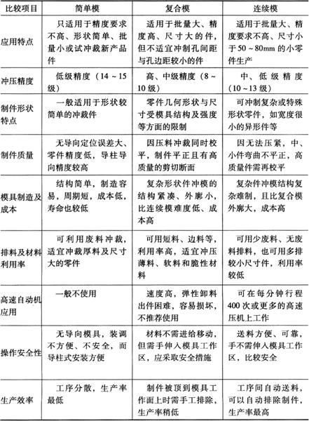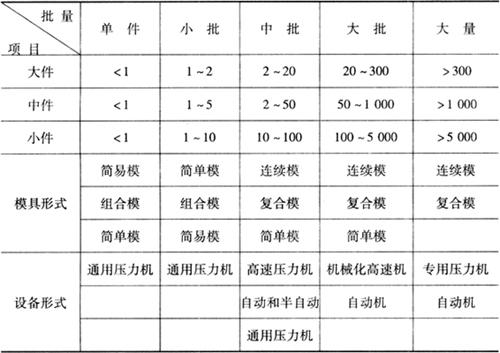 一般情况下,小批量生产时,力求模具结构简单、生产周期短、成本低,应采用单工序模或简易模具;大批量生产时,模具费用在冲裁件成本中所占比例相对较小,可选用复合模或连续模及高效冲压设备,力求提高生产效率。在确定模具类型时还可参考表8-31。表内数字为每年班产量的概略数值,仅供参考。 表8-31 冲压生产批量与合理模具形式(千件)