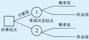 | 释义 | 决策树法 现代经营管理中常用而有效的一种风险型决策方法。 决策者根据酷似树形的图示,系统地对决策过程中不同方案进行比较分析,以取得良好的决策结果。树形图(又称决策图)由决策结点、方案枝、客观状态结点、概率枝、损益值几个部分组成(如图)。决策树法就是通过树形图把一系列具有风险性的抉择环节联系成一个统一的整体,统观全局、取优舍劣。 图中由结点引出的直线表示不同的方案,当决策中舍弃一个方案时,就剪去该方案枝。 这种决策方法形象直观,易于掌握,既适用于单阶段风险型决策,也适用于多阶段风险型决策。