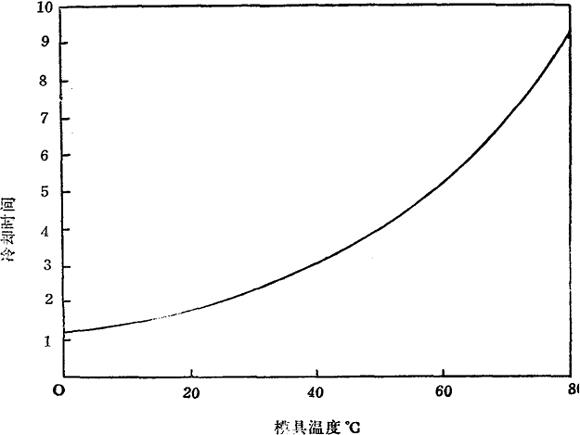 式中:s=最短冷却时间(秒) t=注射制品的厚度(厘米或时) α=塑料的热扩散系数(厘米2/秒或时2/秒) Tx=注射制品的脱模温度(常采用热变形温度)(℃或℉) Tm=模具温度(℃或℉) Tc=料筒温度(℃或℉) 根据此公式,图1-3表示模具温度对冷却时间的影响。