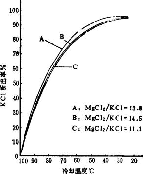| 释义 | 冷却温度 为了选择适宜的冷却温度,可将不同MgCl2/KCl比值的澄清液冷却到不同温度,记录其光卤石的析出情况。数据见表6-2-9,根据表6-2-9的数据绘制成图6-2-15。 表6-2-9 不同MgCl2/KCl比值的澄清、冷却到不同温度时KCl析出率(%)