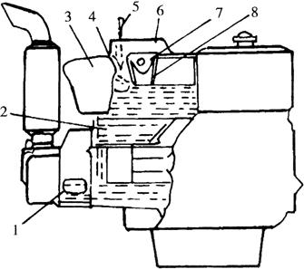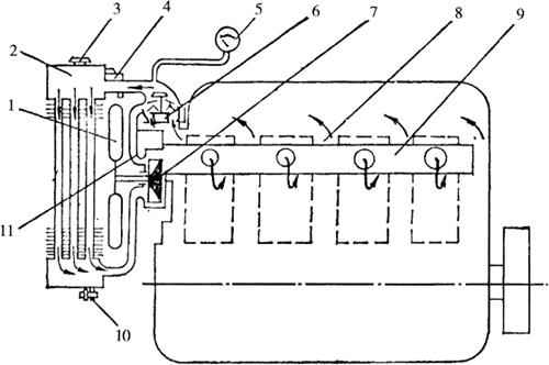 图1-51 蒸发式水冷却系 1.缸盖水套 2.缸体水套 3.水箱 4.浮子 5.红色浮子头 6.加水口 7.滤网 8.漏斗 (三)强制循环式水冷却系 强制循环式水冷却系如图1-52所示。它是依靠冷却水泵产生一定的压力,强制冷却水循环,通过散热器和风扇将吸收的热量散发到大气中,起冷却作用。冷却系中的节温器是控制冷却水的循环方式,循环方式有大循环和小循环两种。如果冷却水温度很低(70℃)时节温器主阀全闭,旁通阀全开,冷却水即进行小循环。