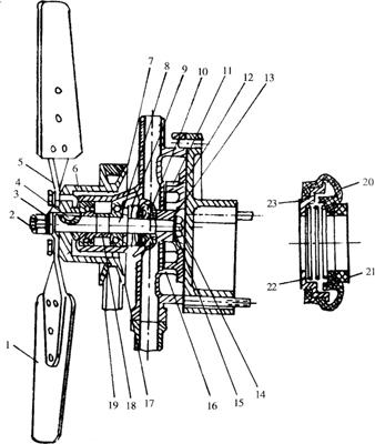 图1-53 水泵和风扇 1.风扇总成 2.螺母 3.垫圈 4.半月键 5.挡圈 6.水泵体 7.皮带轮 8.水泵轴 9.甩水圈 10.水封总成 11.叶轮 12.水泵座 13.键 14.螺母 15.垫圈 16.调整垫圈 17.轴承 18.定位套 19.三角皮带 20.水封体 21.塑料环 22.弹簧 23.弹簧座