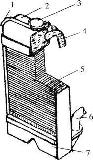 图1-55 散热器 1.溢水管 2.上水室 3.散热器 4.进水管 5.散热器芯 6.出水管 7.下水室 3.节温器 目前采用的节温器有乙醚式和蜡式两种。乙醚式节温器的构造如图1-56所示。皱纹筒内装有沸点低易蒸发的乙醚,当水温低于70℃时皱纹筒内的蒸汽压力低,皱纹筒向下收缩,通过推杆带动主阀和旁通阀向下运动,使主阀全闭,旁通阀全开,这时,冷却水全部进行小循环;当水温增高时,皱纹筒内的蒸汽压力随水温增高而加大,皱纹筒伸长,带动主阀和旁通阀向上运动,使主阀和旁通阀部分打开,此时冷却水有部分进行小循环,另一部分冷却水进行大循环。当水温超过85℃时,皱纹筒伸长到使主阀全开,旁通阀全闭,此时冷却水全部进行大循环。