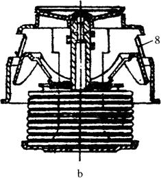 图1-56 乙醚式节温器 a.大循环 b.小循环 1.皱纹筒 2.旁通阀 3.推杆 4.壳体 5.主阀门 6.导向板 7.底座 8.旁通孔蜡式节温器的构造如图1-57所示。感应器体与感应器罩构成一个密封空间,内装有胶管,胶管中心插有导杆。胶管与感应器体之间装有熔点低的石蜡和白蜡混合物。当水温低于70℃时,通往散热器的阀门在弹簧的作用下与阀座接触,处于关闭状态,冷却水只能进行小循环。水温超过70℃时,石蜡混合物开始熔化,体积膨胀,使胶管受压变形,导管下部锥面对胶管压力的垂直分力克服弹簧弹力,使感应器体向下移动,打开阀门,有部分冷却水经阀门流入散热器;仍有部分冷却水进行小循环。当水温达到正常工作温度85℃时,阀门全开,则大部分冷却水进行大循环。