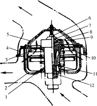 图1-57 蜡式节温器 1.弹簧 2.下支架 3.阀门 4.阀座 5.上支架 6.导杆 7.感应器罩 8.密封圈 9.压板 10.感应器体 11.石蜡混合剂 12.胶管 |