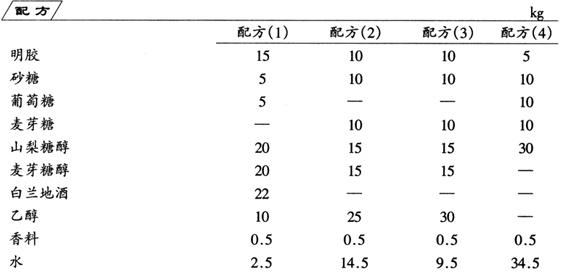 分别将配方(1)、(2)、(3)和(4)中的明胶、3种糖类、2种糖醇和水添加于混合器内,在不断搅拌下加热至80℃,搅拌全溶后,保持3min,进行杀菌,然后加入香料、乙醇或白兰地酒,搅拌混合均匀,即分别制得4种不同的涂布剂。