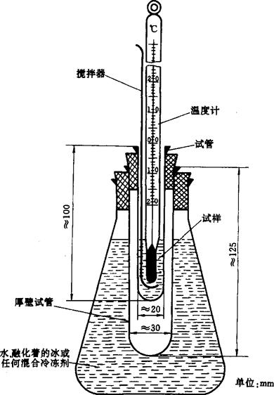 图14-1 冻点测定装置图 2.2 操作步骤 量取干燥试样10mL(如试样为固体,可在尽可能低的温度下融化),置于试管中,将温度计与搅拌棒通过软木塞插入试管,再将试管用软木塞固定于套管中,然后将套管固定于1000mL烧杯内,烧杯内盛低于欲测试样凝固点约5℃的水;装置妥善后(图14-1)即开始上下搅动使试样引起结晶,待温度开始回升停止搅动,当温度上升到最高点或至少保持1min不变时,读取温度,即为冻点。融化后重复测定,直至2次结果相差不超过0.2℃为止。 3.分析结果的表述 试验结束时所观察到的最高温度即为冻点,用℃表示,平行试验结果的允许差为0.2℃。 4.注意事项 4.1 温度计下端应放在离管底约10mm处。 4.2 试样必须充分干燥,否则会使结果偏低。 4.3 某些难以凝固的油,例如黄樟油、苯甲酸苄酯等,可待温度下降至预期凝固点以下1~2℃时,用温度计蘸取少量预先凝固的试样引入作为晶种,以使试样迅速结晶。 4.4 测定苯甲酸苄酯凝固点时,当温度开始回升时,仍应继续搅拌,不可停止,否则凝固点要降低。 4.5 玫瑰油的凝固点不能按上法测定,因在结晶后回升的温度是不固定的,可将烧杯中的水冷却到比预期凝固点低10℃,搅拌到有晶体析出即为冻点。 4.6 合成薄荷脑有双凝固点,要测定双凝固点。 4.7 反复测定最多4次,否则结果偏低。对具体产品的测定可按产品标准执行。 |