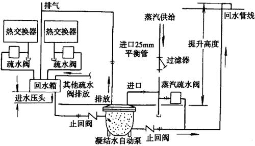 2.采用凝结水自动泵,用蒸汽或压缩空气作动力把凝结水送入回水管。送至锅炉房,如图6-7-3。