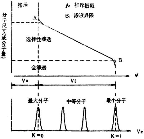 | 释义 | 凝胶渗透色谱分析 1.简介 凝胶渗透色谱也称空间排斥色谱。与其它液相色谱法不同,它是基于试样分子尺寸和形状来实现分离的。凝胶渗透色谱柱的填充剂是凝胶,它是一种表面惰性、含有许多不同尺寸孔穴或立体网状的物质。凝胶孔穴的大小与被分离试样分子的大小相当。太大的分子由于不能进入孔穴而被排斥,所以随流动相的移动而最先流出色谱柱。小分子则完全相反,它渗入大大小小的孔穴中完全不受排斥,所以最后流出。中等大小的分子仅能渗入较大孔隙中,但受到较小孔隙的排斥,所以介于上两者之间流出。图12.11-5是空间排斥色谱的示意图。