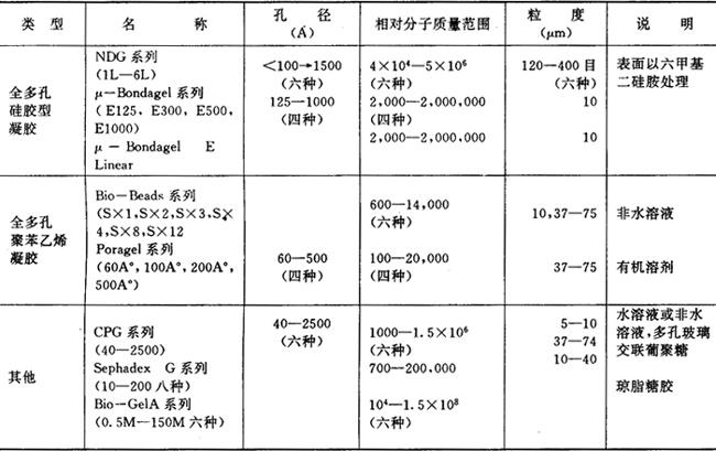图12.11-5 空间排斥色谱法的示意图 2.特点及应用 概括起来,凝胶渗透色谱有以下特点: (1)保留时间是分子尺寸的函数,因此有可能提供分子结构的某些信息; (2)保留时间短,色谱峰窄,容易检测,可用灵敏度低的检测器; (3)固定相与分子间的作用力很弱,趋于零,即柱子不能很强地保留分子,所以柱寿命很长; (4)不能分辨分子大小相近的化合物,一般说来分子差别在10%以上时才能分离。因此此法不能分离复杂化合物,通常是用来获得分散性聚合物的相对分子质量分布情况。 凝胶色谱柱填料一般分为有机和无机两类。有机柱填料,如交链聚苯乙烯等,柱效高但机械强度、热稳定性、化学惰性较差,易老化,使用要求高。无机柱填料,如多孔硅胶和多孔玻璃等,柱效较差但性能稳定,可长期使用。表12.11-10列出了常用的凝胶色谱填充剂的技术规格。凝胶色谱的流动相应能完全溶解试样,与检测器匹配,希望其粘度低,沸点比柱温高20~50℃,对凝胶没影响。 表12.11-10 常用的凝胶色谱填充剂