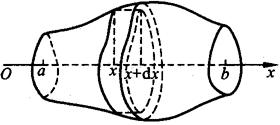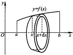 图7.5 取以dx为底的窄曲边梯形绕x轴旋转而成的薄片的体积为体积元素 dV=π[f(x)]2dx, 旋转体体积为