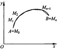 平面曲线的弧长 1.平面曲线弧长的概念 设A,B是曲线弧上的两个端点,在弧上插入分点A=M0,M1,…,Mi,…Mn-1,Mn=B,并依次连接相邻分点得一内接折线,当分点的数目无限增加且每个小弧段都缩向一点时,此折线的长