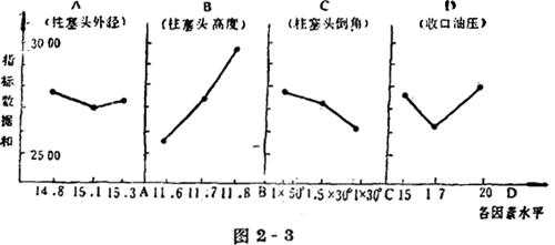 计算: 第一步:求出每组试验之和。由表2-2,3可知,试验共分三组,其和分别记为Ⅰ,Ⅱ,Ⅲ。 ⅠA:857+951+909=2717 ⅡA:878+973+899=2750 ⅢA:803+1030+927=2760 把ⅠA,ⅡA,ⅢA填入表2-3的下端栏内。 同样按表2-3分别求出B,C,D三个因素的三组试验Ⅰ,Ⅱ,Ⅲ之和。 B因素的三组试验为:1,4,7;2,5,8;3,6,9 C因素的三组试验为:1,6,8;2,4,9;3,5,7 D因素的三组试验为:1,5,9;2,6,7;3,4,8 其和分为:ⅠB=2538,ⅡB=2954,ⅢB=2735, ⅠC=2786,ⅡC=2756,ⅢC=2685, ⅠD=2757,ⅡD=2653,ⅢD=2817。 第二步:求出极差,算出Ⅰ,Ⅱ,Ⅲ之后,把Ⅰ,Ⅱ,Ⅲ中最大值和最小值之差算出来,我们把差值称之谓极差。 RA=2760-2713=47 RB=2954-2538=416 RC=2786-2685=101 RD=2817-2653=164 第三步:依极差分析试验结果: (1)分析各因素对指标影响的重要程度。在按某因素的水平分得的每个试验组中,该因素的同一水平出现三次,而其他因素各水平只出现一次。当比较数据Ⅰ,Ⅱ,Ⅲ的太小时,可认为其他因素对Ⅰ,Ⅱ,Ⅲ的影响大体相同,Ⅰ,Ⅱ,Ⅲ之间的差异,是由于该因素取了三个不同的水平而引起的。由此可见,极差反映了该因素取了三个不同水平对指标的影响。因此,可按因素极差大小排列出因素影响的主次顺序:柱塞头高度、收口油压、柱塞头倒角、柱塞头外径。 (2)找出最佳指标的各因素水平。研究的目的是提高拉脱力,挑选出每个因素的Ⅰ,Ⅱ,Ⅲ中最大值所对应的水平,从而组合成一组保证拉脱力最大的实施方案。由表2-3可知,他们是:ⅢA(A3)、ⅡB(B2)、ⅠC(C1)、ⅢD(D3)。即试验号为8,其柱塞头外径为14.8mm,柱塞头高度11.8mm,柱塞头倒角为1×50°、收口油压为20kg/cm2。 (3)找出进一步试验研究的方向。图2-3是用线型表示各因素水平变化对拉脱力数据之和的影响。由图中可以看出,柱塞头高度从11.6mm增加到11.8mm时,拉脱力逐步提高。其他因素分析由图2-3便一清二楚。如果还望希进一步提高拉脱力,则B因素取大于11.8mm及D因素取大于20kg/cm2。