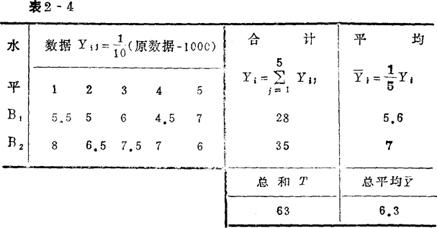 第二步,计算因素水平变化引起的数据波动。 由表2-4可知,各水平条件下数据的平均值为5.6和7,它们大致是围绕总平均值6.3而波动,以S因表示,其计算公式为:
