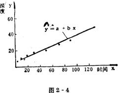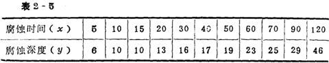 以表2-4数据代入: S总=(5.5-6.3)2+…+(6-6.3)2=11.1 S总=S因+S误=11.1,由此可见,总的变动一般为两部分组成:即因素变动;误差变动。 第四步,因素显着性检验。 为了分折因素水平变化对指标影响的大小,还需把水平变化引起的波动与试验误差引起的波动进行比较。首先要克服试验数据个数的影响,为此,引入自由度的概念。所谓自由度,就是独立的数据个数。设因素自由度用f因,误差自由度用f误以及总自由度用f总来表示。 f总=总的试验数-1,本例:f总=10-1=9 f因=某因素的水平数-1,f因=2-1=1 f误=f总-f因 f误=9-1=8 若将因素变动S因除以它的自由度即S因/f因;将误差变动S误除以它的自由度即S误/f误;便消除了个数的影响。 比较S因/f因与S误/f误的大小。若S因/f因≈f误/f误,说明某因素的水平改变对指标的影响在误差范围之内,水平变化对指标无显着影响。若S因/f因大于S误/f误,则表明因素水平变化对指标的影响,超过了试验误差造成的影响。但是要大多少才能认为因素的影响明显的超过误差的影响呢?这就要确定F因= 利用F检验临界值表作显着性检验,简称为F检验。本例中: (三)回归分析法 回归分折法是研究两个或多个变量之间统计规律的数学方法。其内容很多,这里仅介绍处理两个变量之间关系的一元线性回归分析,至于多元回归等请参阅有关书籍。 例:在某产品表面进行腐蚀刻线试验,得到腐蚀深度y与腐蚀时间x的一组数据(表2-5),试求腐蚀时间与深度之间经验公式解:第一步,把试验数据用散点表示出来,如图2-4。