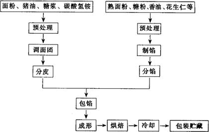 | 释义 | 几种糖浆皮月饼的制作实例 (一)双麻月饼 1.配方(kg) 皮料:面粉35,糖浆17.5,猪油9.5,碳酸氢铵0.1; 馅料:熟面粉13,糖粉13,猪油6.5,香油1,花生仁2,核桃仁1,青梅1,橘饼1,桂花1,水1.5; 薄面与装饰料:面粉1,芝麻仁适量。 2.工艺流程 双麻月饼工艺流程见图2-4-6。
