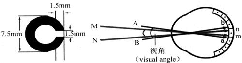 | 释义 | 几种视觉生理现象 (一)暗适应与明适应 1.暗适应(dark adaptation) 人从明处突然到暗处,开始看不清物体,经过一段时间后,逐渐可以看清物体,这个过程称为暗适应。暗适应的时间约为20~30分钟左右。在暗适应过程中,眼对光的敏感度逐渐升高。暗适应的本质是视紫红质再生的过程。因为在强光下,视紫红质受光的刺激,大量分解,人从明处进入暗处,视杆细胞中的视紫红质含量很少,弱光刺激引起视紫红质的分解不足以产生动作电位而引起视觉,所以看不清物体。但是在暗光下,视紫红质的合成大于分解,随着视紫红质含量的增加,弱光刺激引起视紫红质分解也增加,而产生动作电位,人就能在暗光下看清物体。因为视紫红质的合成需要维生素A,如果维生素A缺乏,视紫红质的合成减少,人的暗适应能力下降,在暗处视物不清,称为夜盲症(night blindness,nyctalopia)。补充维生素A可治疗夜盲症。动物的肝脏中含有大量的维生素A。胡萝卜中含有胡萝卜素,胡萝卜素在体内可以转变成维生素A。 2.明适应(light adaptation) 人从暗处突然进入明处,会感到一时耀眼的光亮,看不清物体,经一段时间后才能恢复视觉,这种现象称为明适应。明适应的时间较暗适应快,约1分钟。明适应产生的原理也和视杆细胞有关。在暗处视杆细胞中含有大量的视紫红质(rhodopsin),从暗处到明处,强光照射,使视紫红质大量快速分解,产生耀眼的光亮。在视杆细胞中的视紫红质迅速分解之后,对光不敏感的视锥细胞中的感光色素在明亮的环境中感受光的刺激,使人看清物体。 (二)视敏度 视敏度(visual acuity)也称为视力。视敏度是指眼分辨物体细微结构的能力。一般用分辨两点间的最小距离来衡量。视力表就是根据这个原理研制的。物体上两点发出的光线入眼后在节点交叉形成的角称为视角(visual angle)。正常眼的视角为1分角,此时两点在视网膜上形成的像刚好落在不相邻的两个视锥细胞上,中间隔着一个视锥细胞(图13-15),这样皮层视中枢产生两点的感觉。如果物体上两点发出的光线入眼,形成的视角小于1分角,在视网膜上两点的成像落在相邻的视锥细胞上,人就无法分辨两点,会把两点看作一点。人在5米的距离,能分辨视力表上相距1.5mm的两点,其视力定为1.0,两点形成的视角正好为1分角。