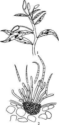 图6-23 凤仙花褐斑病 1.症状 2.病原菌的子座,分生孢子梗及分生孢子 【病原】 凤仙花褐斑病原为凤仙花灰星尾孢霉。Cereospora fu-kushiana(Matsuura)Yamamota.子座不发达。分生孢子梗丛生,从叶片气孔伸出,直或波纹状,不常分隔或分枝,大小25.2~158.4微米×4.3~7.0微米。分生孢子倒棒形或针形,直或微弯,无色,隔膜不明显,基部钝圆或平切,顶端尖,大小20~100微米×3~4.8微米。6月末发生,8~9月较多,10月末逐步减少。 【发病规律】 以菌丝体在病残体中越冬。第二年形成分生孢子侵染传播。果实也可能是初侵染来源之一。 【防治方法】 (1)冬季清除枯枝落叶、病残株,集中烧毁,这是防治的关键。 (2)在无病、健壮的植株上采种,播种前用高锰酸钾或代森锌进行种子消毒。 (3)6月发病前喷洒0.5%波尔多液。发病后可选喷50%可湿性甲基托布津800~1000倍液,或50%代森铵1000倍液,或75%可湿性百菌清600~800倍液。 |