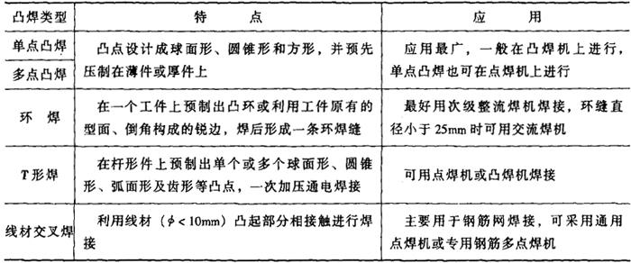 | 释义 | 凸焊的特点、分类和应用 凸焊是在一焊件的贴合面上预先加工出一个或多个凸起点,使其与另一焊件表面相接触并通电加热、然后压塌,使这些接触点形成焊点的电阻焊方法。 凸焊的基本类型有:单点凸焊和多点凸焊、环焊、T形焊、滚凸焊、线材交叉焊等。 常用凸焊方法及其特点如表1-8-31所示。最常见的凸焊方法是单点凸焊和多点凸焊。凸点的作用是将电流和压力局限在工件的特定位置上。 表1-8-31 常见凸焊方法及其特点