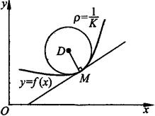 图4.3 曲率圆与曲率半径 设曲线y=f(x)在点M(x,y)处的曲率为K(K≠0).在点M处的曲线的法线上,在凹的一侧取一点D,使