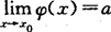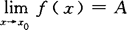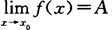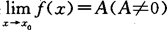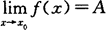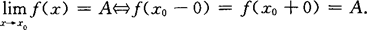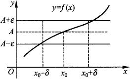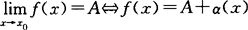 | 释义 | 函数的极限 自变量趋向有限值时函数的极限定义 设函数f(x)在点x0的某一去心邻域内有定义.如果对于任意给定的正数ε,不论它多么小,总存在相应的正数δ,使得满足不等式0<|x-x0|<δ的一切x,对应的函数值f(x)都满足不等式 |f(x)-A|<ε,则称常数A为函数f(x)当x→x0时的极限,记作 或f(x)→A(x→x0). 简述为“ε-δ”定义: 自变量趋向有限值时函数的极限几何意义 任意给定一正数ε,作平行于x轴的两条直线y=A+ε和y=A-ε,存在着点x0的一个去心δ邻域